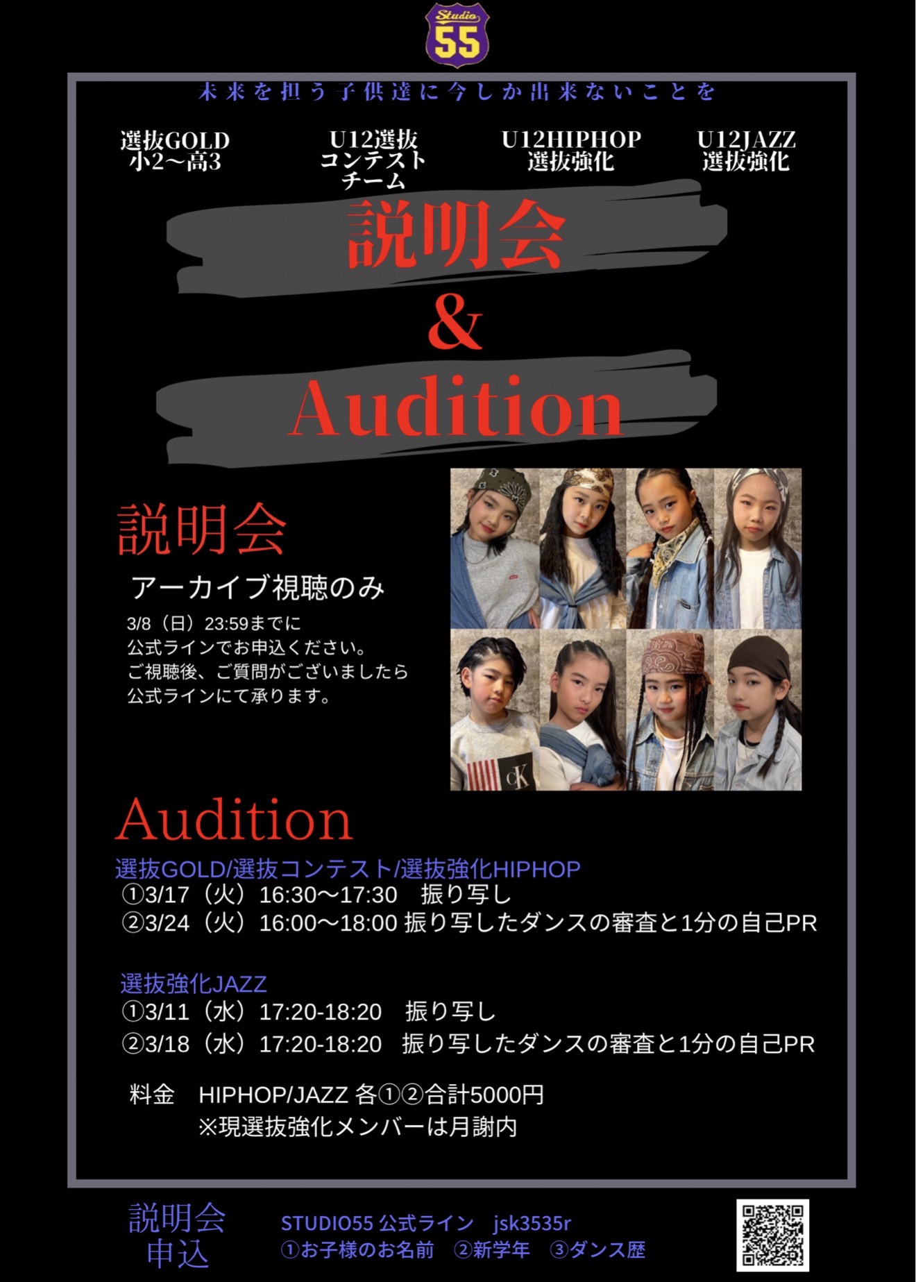 STUDIO55は、幼児クラス・小学生クラス・大人クラス・ママクラス・キッズ選抜クラスがあります。