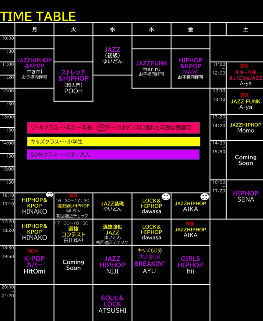 キッズ…小学生対象。月木金16:10-のクラスは低学年向き、17:20-のクラスは高学年向き。低学年でダンスを長く踊っている方は高学年クラスを受講できます。
